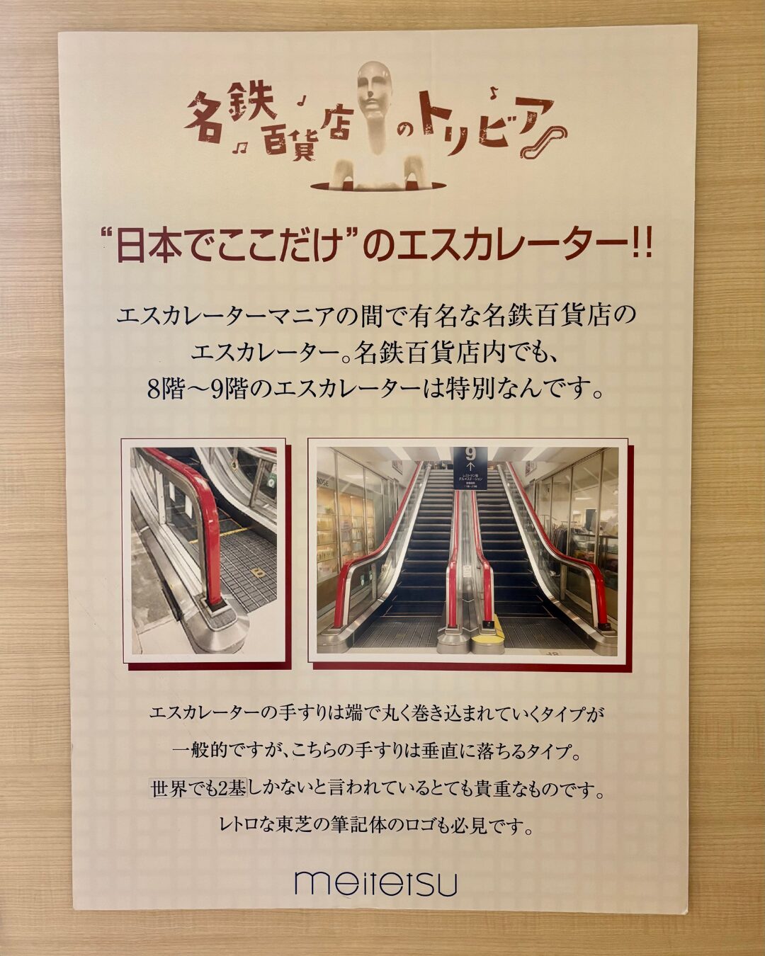 『名鉄百貨店』本館8階〜9階には世界で2基しかない、手すりが垂直に落ちる珍しいエスカレーターがあるんです。