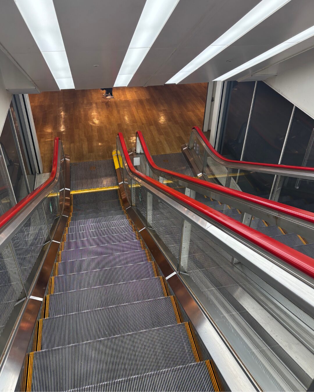 動く姿をお見せしたいのですが写真ですみません。エスカレーターマニアさんの間では昔から有名で、YouTubeにも動画がありますのでぜひ探してみてください。手すりが落ちていく様子を見ていると心が落ち着きます。
