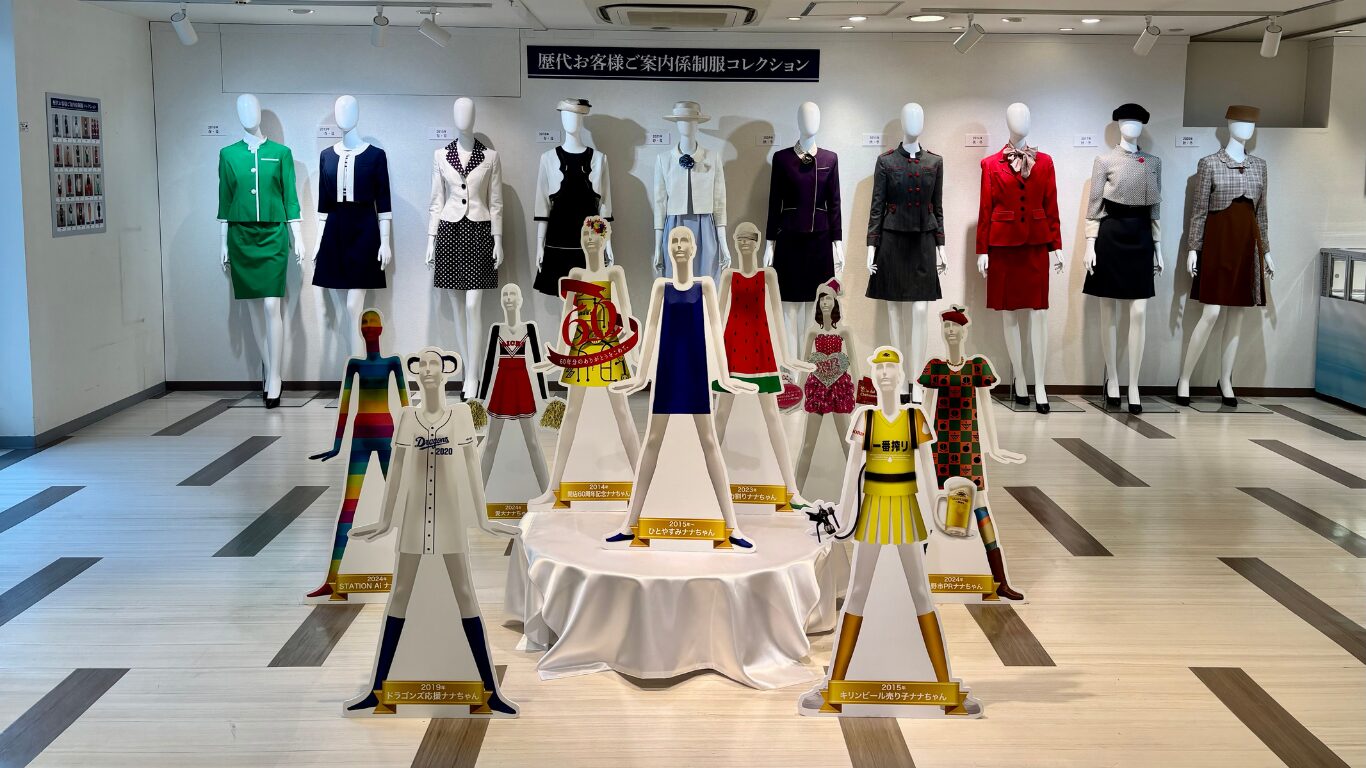 展示の最初には(おそらく)名鉄百貨店のテーマソングが流れる中(歌詞がいい)、「歴代お客様ご案内係制服コレクション」「歴代ナナちゃんコレクション」がお出迎え。
