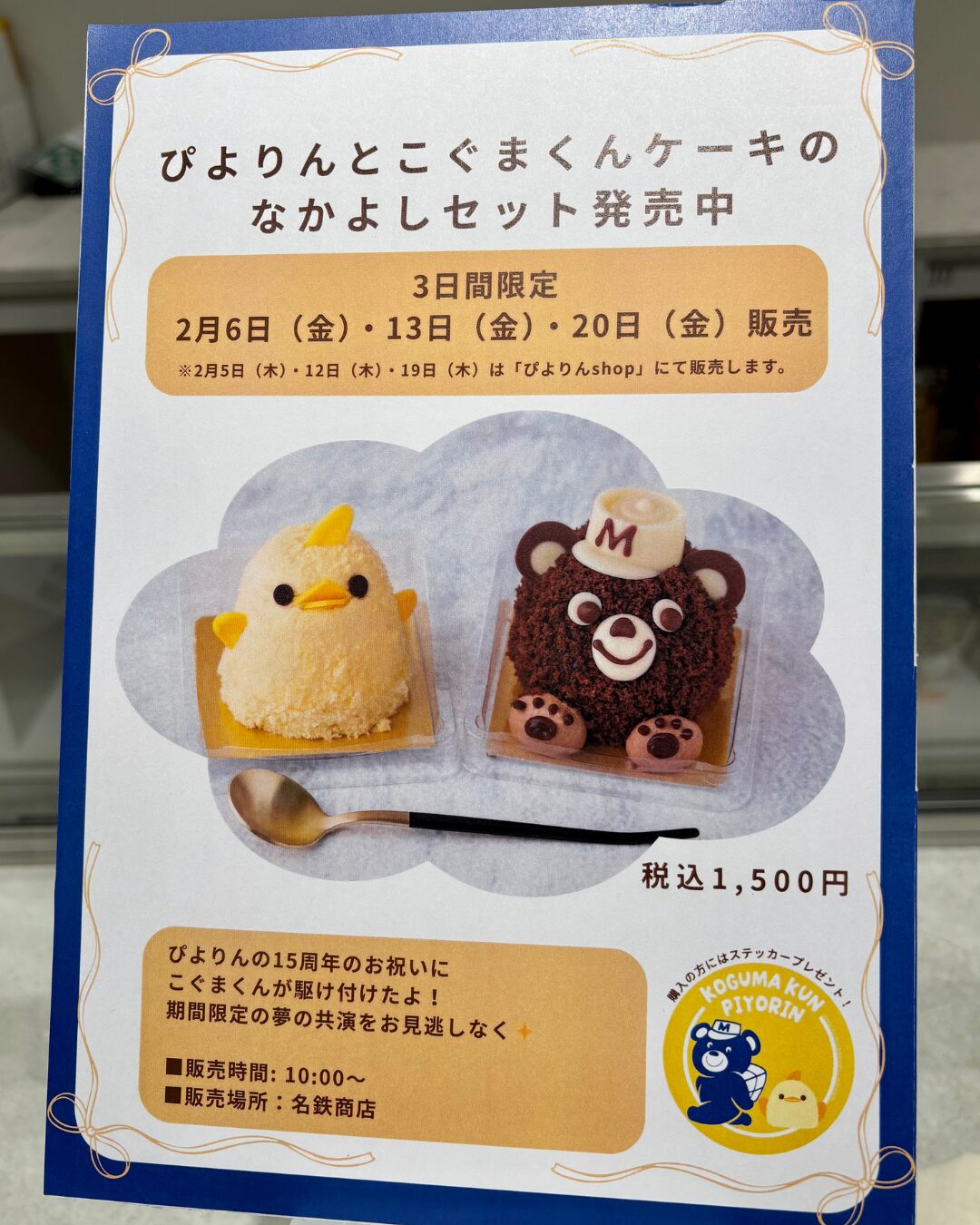 将棋の藤井聡太さんが対戦中食されたことで有名になった「ぴよりん」と、名鉄のマスコットキャラクター「こぐまくん」がコラボしたケーキが期間限定で発売されています。